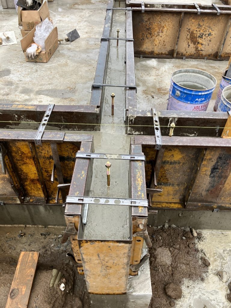 - 型枠の最終チェック コンクリートの圧力に耐えられるよう、締め付けや通りを細かく確認しました。わずかなズレが仕上がりに影響するため、慎重に調整しています。