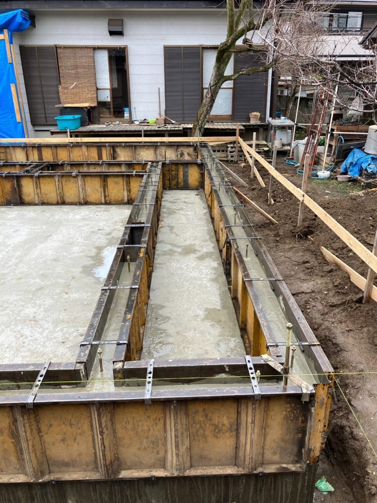 コンクリートが十分に硬化するまで養生期間を設け、その後型枠を外します。 次の工程は基礎の完成検査 → 土台敷き → 上棟へと進んでいきます。