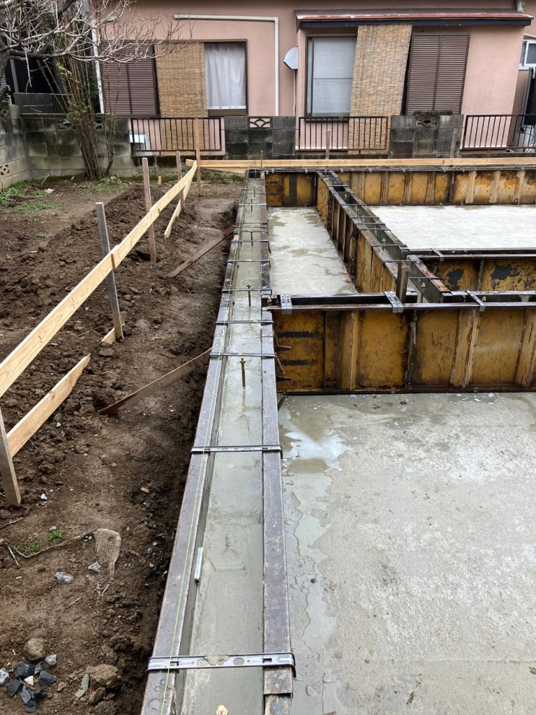 打設後は天端レベラーで高さを整え、きれいに仕上がりました。天端の精度は、後の土台据え付けに影響するため非常に重要です。今回も水平精度の高い仕上がりとなっています。
